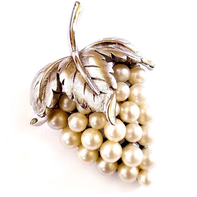 【 アンティーク・ヴィンテージジュエリー 】 商品: ブローチ。 ブランド: Trifari トリファリ(刻印あり)。 デザイン: パールの果実装飾シルバーぶどう。 サイズ: 4.3cm。 状態: 大変綺麗なエクセレントコンディションです。