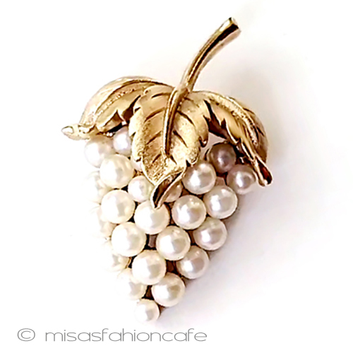 【 アンティーク・ヴィンテージジュエリー 】 商品: ブローチ。 ブランド: Trifari トリファリ(刻印あり)。 デザイン: パールの果実装飾ゴールドの葉ぶどう。 サイズ: 4.3cm。 状態: 大変綺麗なエクセレントコンディションです。