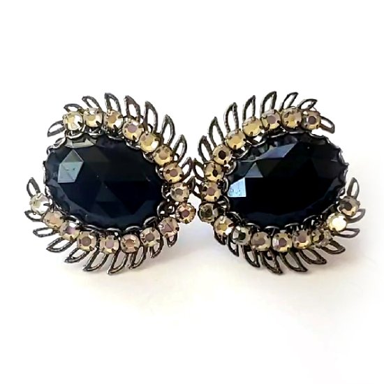 商品: イヤリング。 ブランド:Miriam Haskell ミリアムハスケル(刻印あり) デザイン:爪留めクリスタル&フレンチジェット&銀葉。 サイズ: 3.3cm。 状態: 大変良いエクセレント・コンディションです。