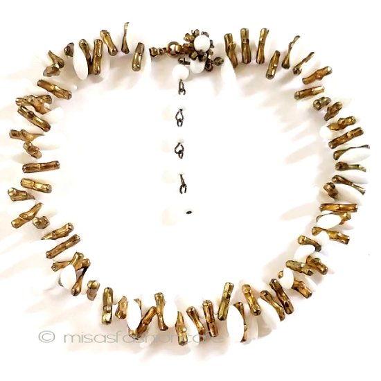 商品: ネックレス。 ブランド:Miriam Haskell ミリアムハスケル(刻印あり)。 デザイン:ミルクガラス・珊瑚型Goldビーズ&お花装飾金具。 サイズ: 43cm。 状態: とても良いコンディションです。