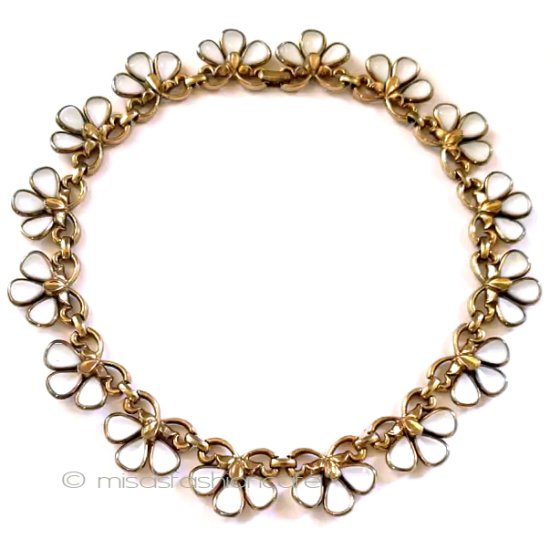 商品: チョーカーネックレス。 ブランド: Trifari トリファリ (刻印あり)。 デザイン: ミルクガラスの花びら装飾Goldフラワー。 サイズ: 37cm。 状態: とても良いヴィンテージコンディションです。 *5cm前後長さ調節を持たせたい場合には、市販の アジャスターチェーンを付けるのがお勧めです^^
