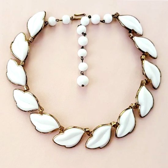 商品: ネックレス。 ブランド: Trifari トリファリ (刻印あり)。 デザイン: ミルクガラス装飾GOLD花びらリーフ。 サイズ: 41cm。 状態: 大変良いエクセレントコンディションです。